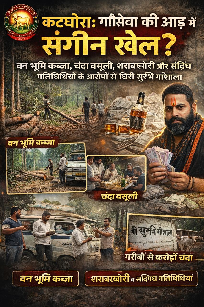 कटघोरा/लखनपुर। धर्म और गौसेवा के नाम पर संचालित श्री सुरभि गौशाला लखनपुर अब श्रद्धा नहीं, बल्कि सवालों का केंद्र बन चुकी है। स्थानीय नागरिकों और सामाजिक कार्यकर्ताओं ने गौशाला प्रबंधन पर ऐसे गंभीर आरोप लगाए हैं, जिन्होंने पूरे क्षेत्र में सनसनी फैला दी है। आरोपों में वन विभाग की लगभग 10 एकड़ भूमि पर कब्जा, सरकारी गौठान को निजी नियंत्रण में लेना, गौवंश के नाम पर चंदा वसूली और परिसर में कथित अवैध गतिविधियों का संचालन शामिल है।