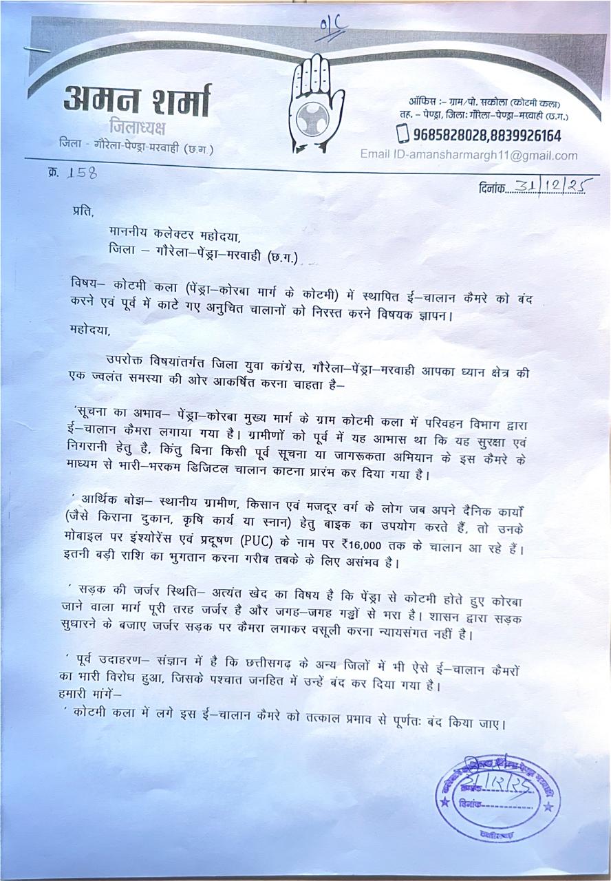 कोटमी कला में ई-चालान कैमरे का विरोध, युवा कांग्रेस ने कलेक्टर को सौंपा ज्ञापन__ग्रामीणों पर ₹16 हजार तक के चालान का आरोप, कैमरा बंद करने और चालान माफी की मांग,,