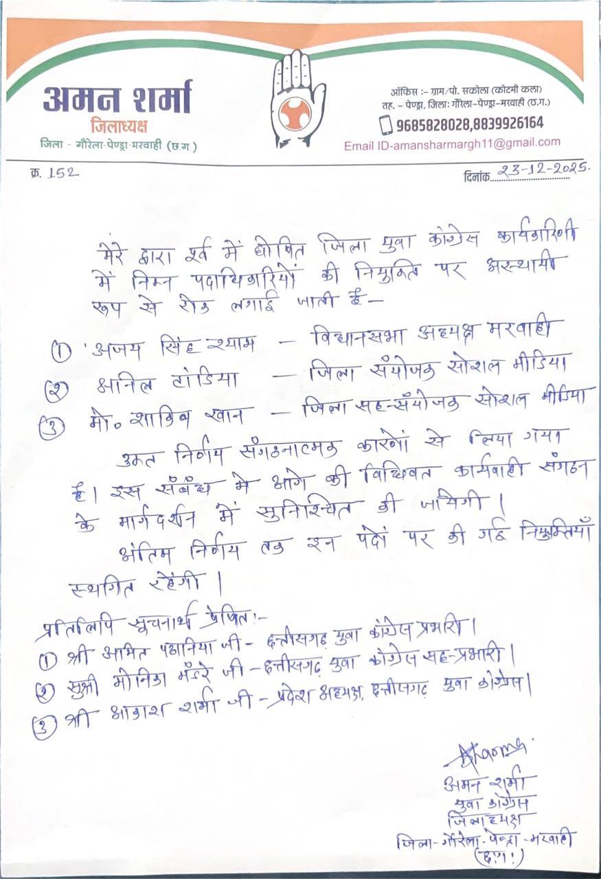 जारी पत्र के मुताबिक, विधानसभा अध्यक्ष मरवाही के पद पर नियुक्त अजय सिंह श्याम, जिला संयोजक सोशल मीडिया अनिल टाड़िया तथा जिला सह-संयोजक सोशल मीडिया मो. शाकिब खान की नियुक्ति पर फिलहाल रोक लगाई गई है।
