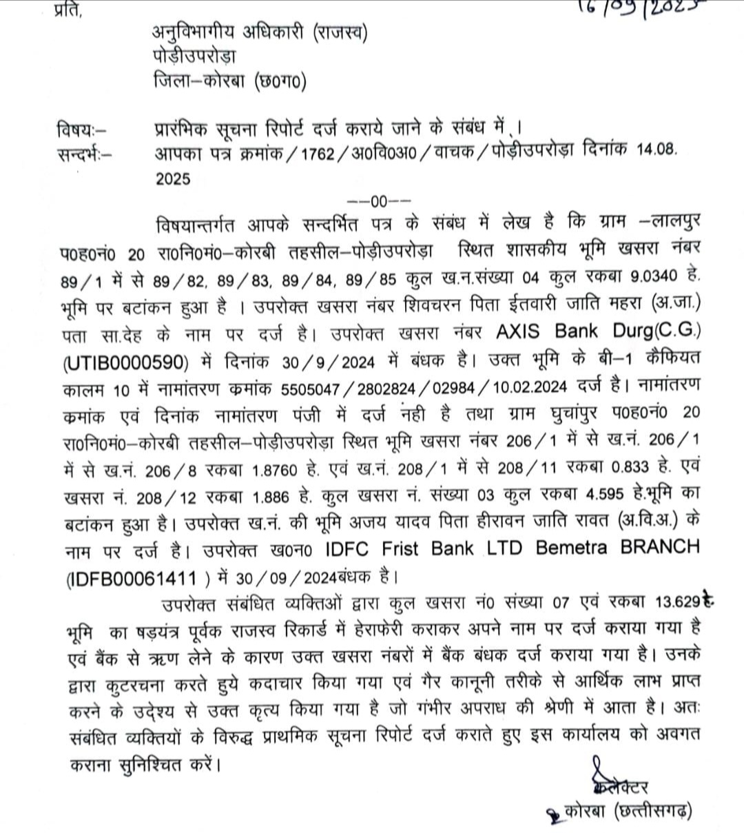 CG: कोरबा और गौरेला-पेंड्रा-मरवाही जिलों में सरकारी जमीन की हेराफेरी और कुटरचना का मामला उजागर हुआ है, जिसने प्रशासन और कानून व्यवस्था की विश्वसनीयता पर गंभीर सवाल खड़े कर दिए हैं। कोरबा जिले के पोंडी उपरोड़ा क्षेत्र में सरकारी जमीन पर बड़े पैमाने पर साजिशपूर्वक हेराफेरी की गई। लालपुर और घुचांपुर ग्रामों में कुल 13.629 हेक्टेयर सरकारी जमीन को पटवारी और उनके सहयोगियों ने निजी व्यक्तियों के नाम पर दर्ज कर बैंकों से करोड़ों रुपये का ऋण हड़प लिया। इस खुलासे के बाद कलेक्टर ने FIR दर्ज कर संबंधित व्यक्तियों के खिलाफ सख्त कार्रवाई के निर्देश दिए।