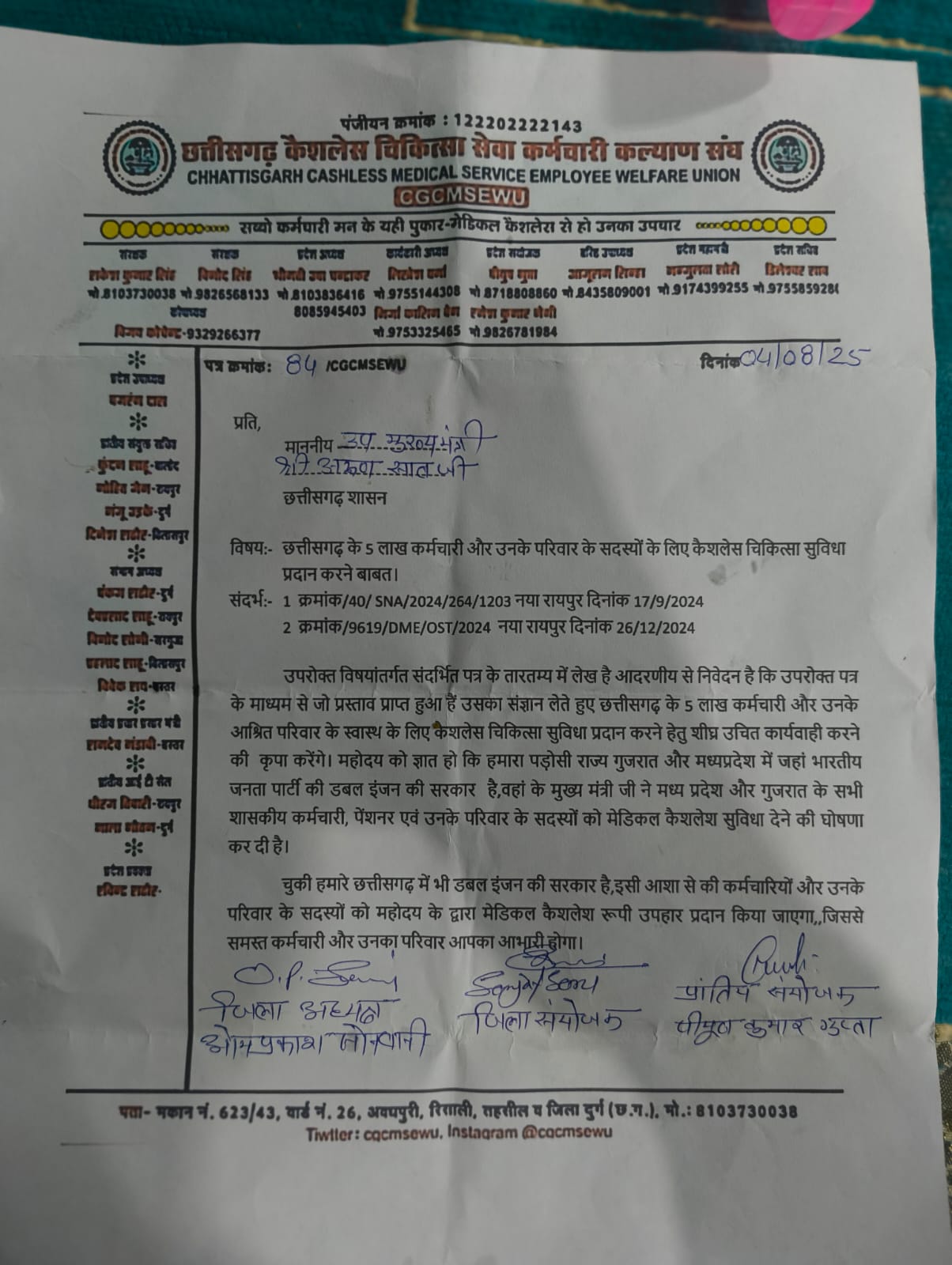 संघ के प्रतिनिधियों ने इस दौरान शासन के पूर्व में जारी संदर्भ क्रमांक/40/SNA/2024/264/1203 दिनांक 17 सितंबर 2024 और क्रमांक/9619/DME/OST/2024 दिनांक 26 दिसंबर 2024 का हवाला देते हुए कहा कि इन प्रस्तावों के आधार पर शीघ्र निर्णय लेकर राज्य के कर्मचारियों को स्वास्थ्य सुरक्षा की सौगात दी जाए। उन्होंने बताया कि पड़ोसी राज्य मध्यप्रदेश और गुजरात में, जहां भारतीय जनता पार्टी की डबल इंजन सरकार है, वहां के मुख्यमंत्री पहले ही शासकीय कर्मचारियों, पेंशनर्स और उनके परिवारजनों को मेडिकल कैशलेस सुविधा देने की घोषणा कर चुके हैं। छत्तीसगढ़ में भी डबल इंजन सरकार होने से उम्मीद है कि यह सुविधा यहां भी जल्द लागू होगी।