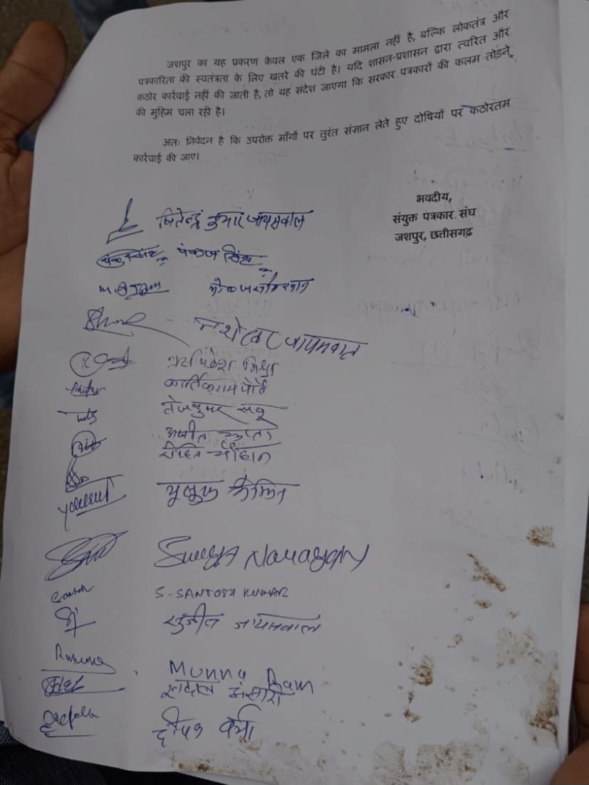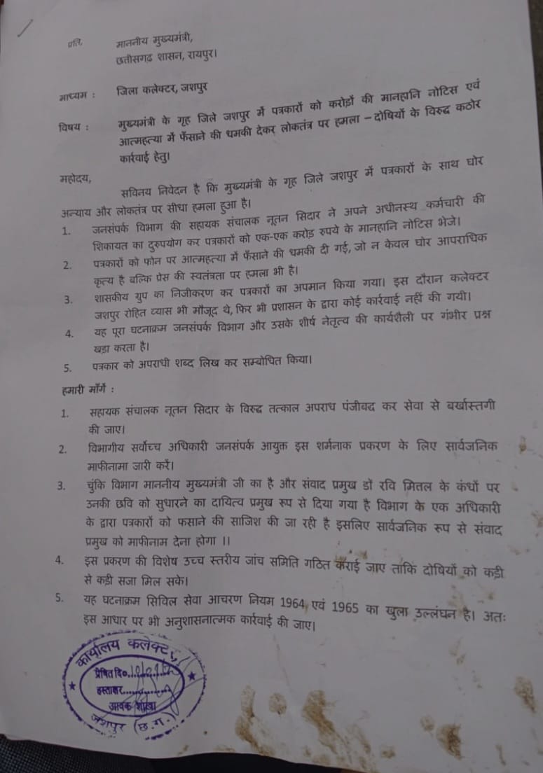 जशपुर। छत्तीसगढ़ के मुख्यमंत्री विष्णुदेव साय के गृह जिले में जनसंपर्क विभाग और पत्रकार समुदाय के बीच ऐसा विवाद उत्पन्न हुआ है जिसने प्रदेश की लोकतांत्रिक व्यवस्था को हिलाकर रख दिया है। मामला उस समय गरमाया जब सहायक संचालक जनसंपर्क नूतन सिदार ने पत्रकारों को करोड़ों रुपए की मानहानि नोटिस भेज दी और उन्हें आत्महत्या के केस में फंसाने की धमकी दी। इस गंभीर कृत्य से आहत होकर संयुक्त पत्रकार संघ जशपुर ने मुख्यमंत्री के नाम जिला कलेक्टर को पांच सूत्रीय मांगों के साथ संयुक्त हस्ताक्षरित ज्ञापन सौंपा, जिसमें दोषियों के विरुद्ध कड़ी कार्रवाई की सख्त मांग की गई है।