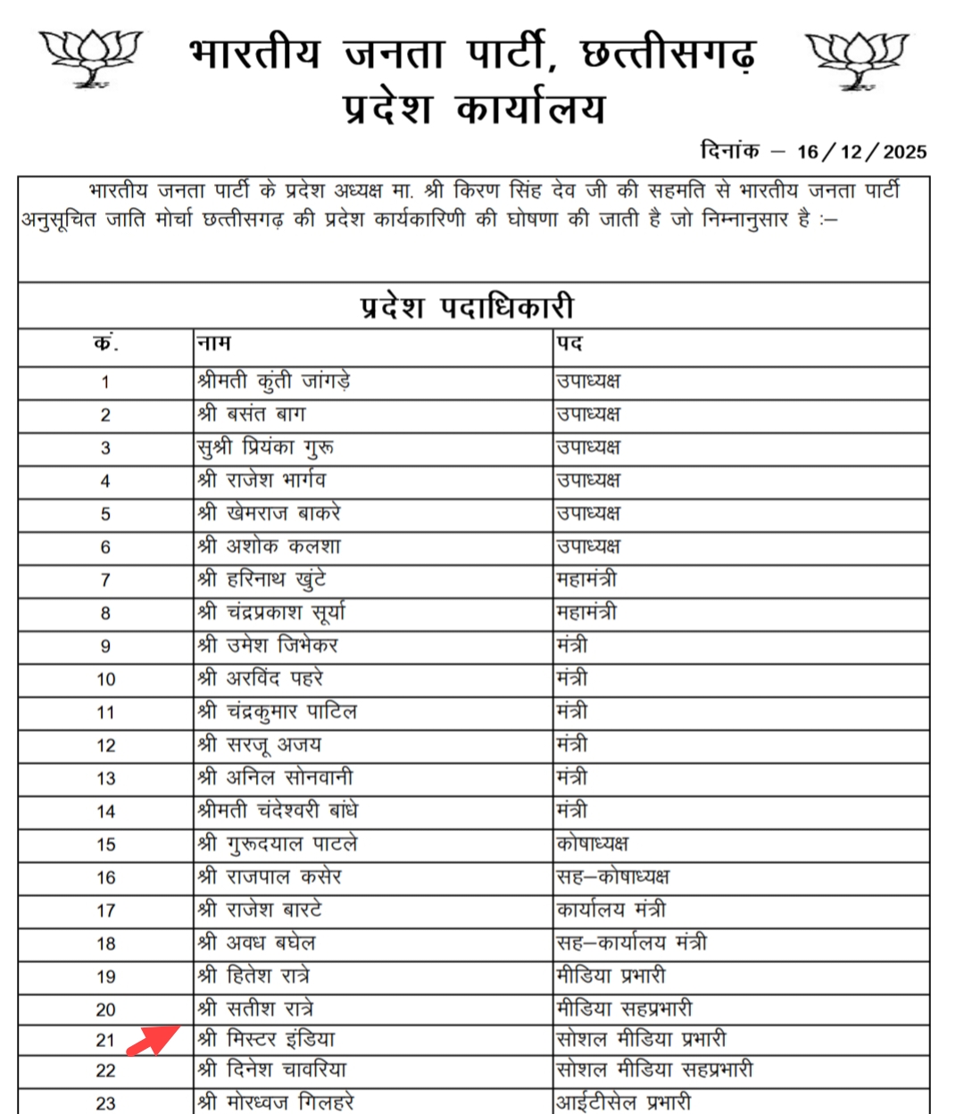 नियुक्तियों के बीच एक मामला ऐसा भी सामने आया, जिसने पार्टी के भीतर ही चर्चा और मज़ाक का माहौल बना दिया। अनुसूचित जाति मोर्चा में सोशल मीडिया प्रभारी के रूप में “श्री मिस्टर इंडिया” नाम सूची में दर्ज होने से कार्यकर्ता हैरान रह गए।